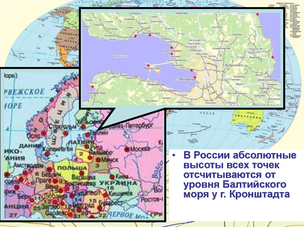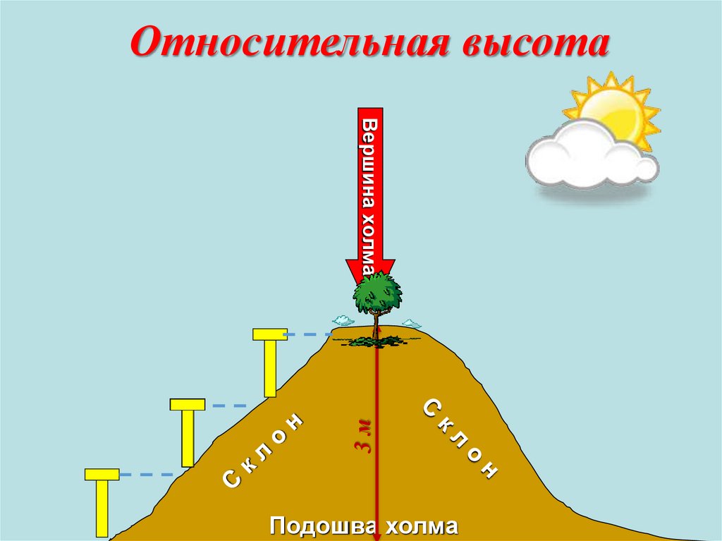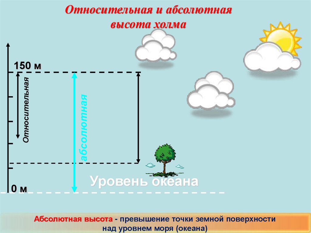 • Абсолютная высота - превышение точкиземной поверхности над уровнем моря