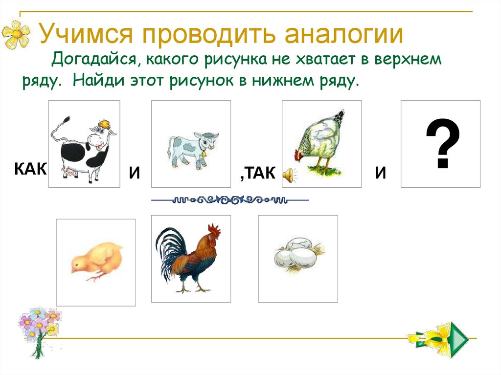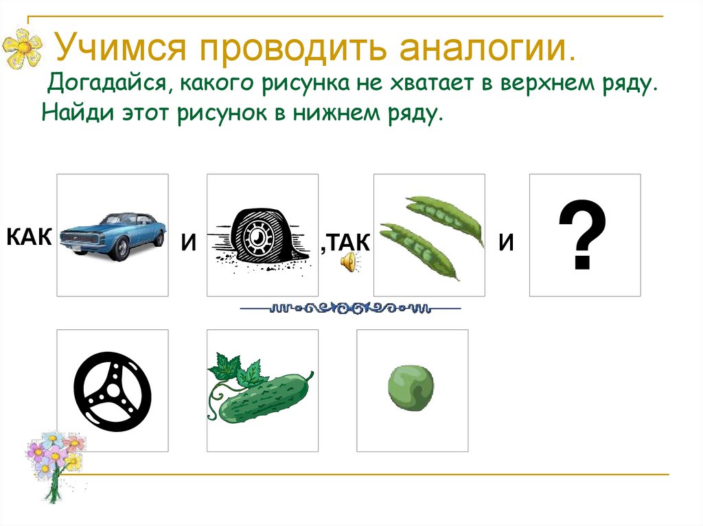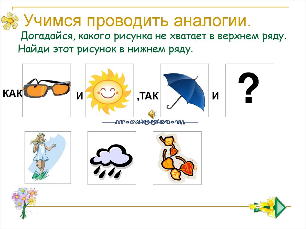 Учимся проводить аналогииДогадайся, какого рисунка не хватает в верхнем