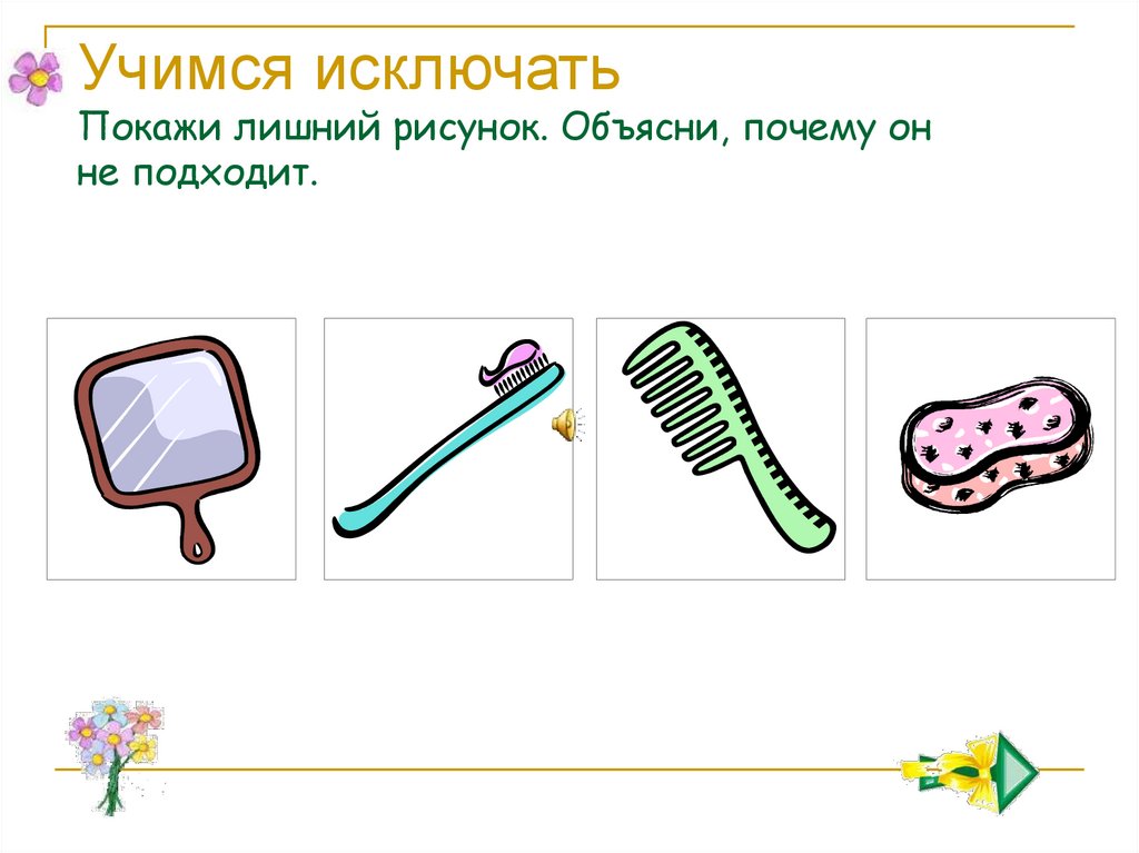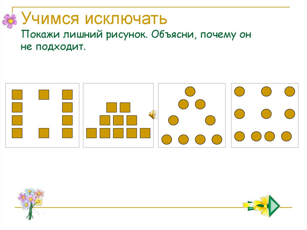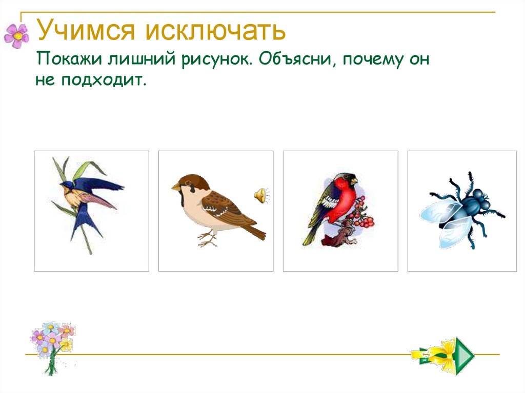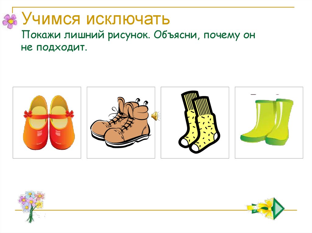 Учимся исключатьПокажи лишний рисунок. Объясни, почему он