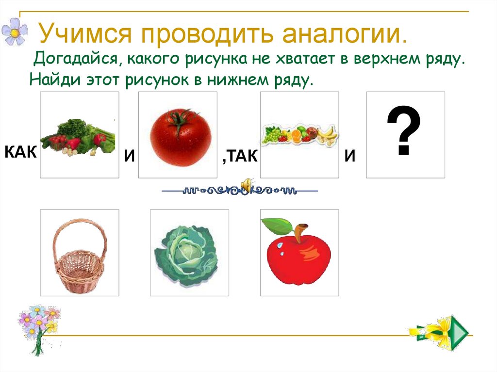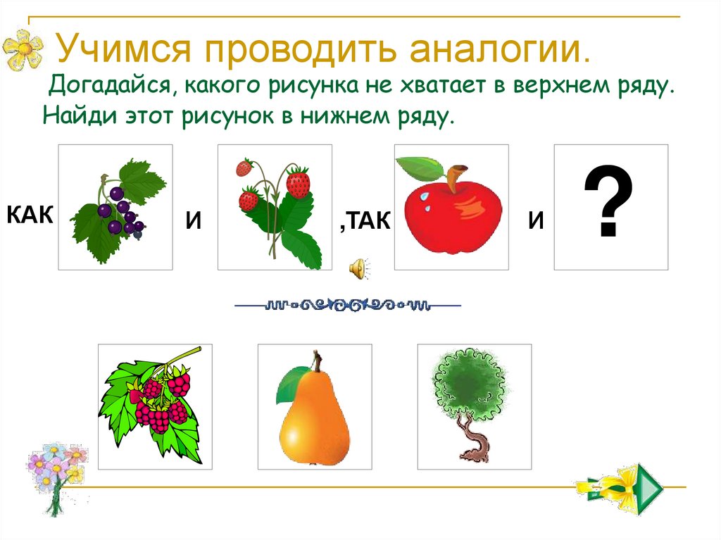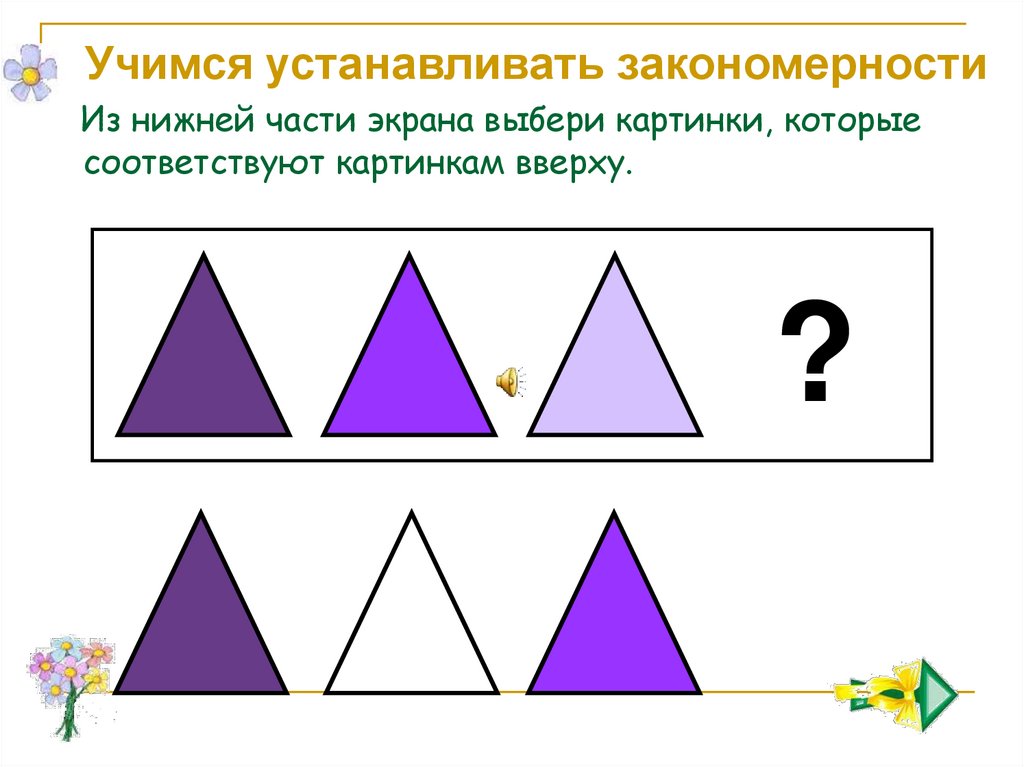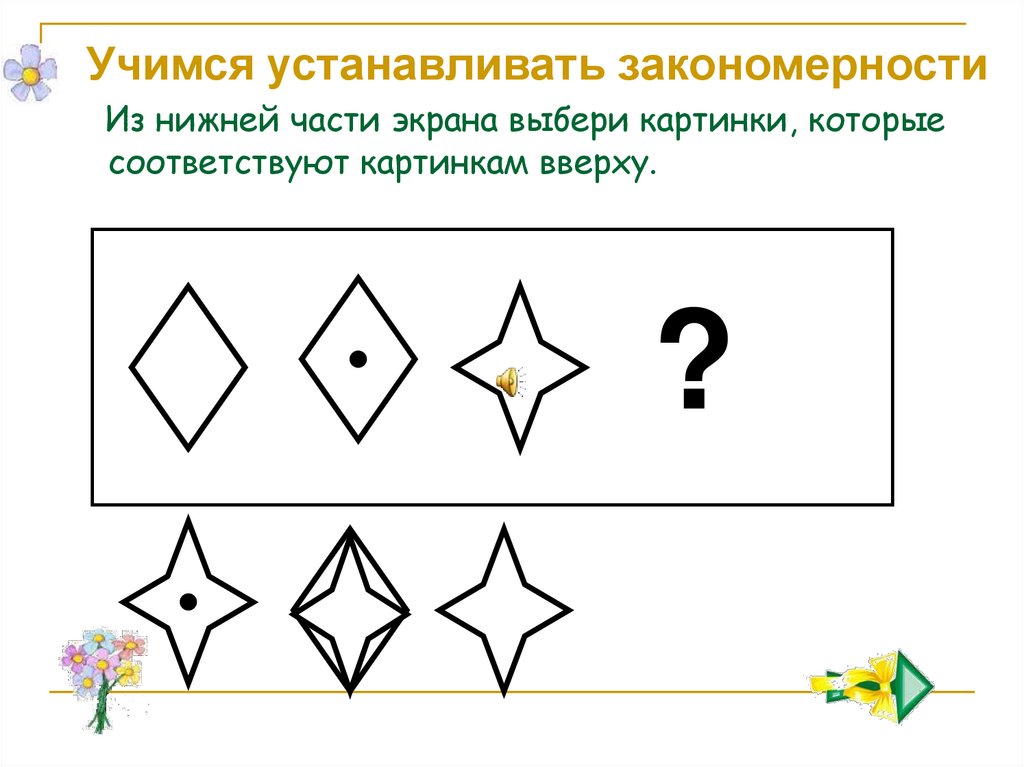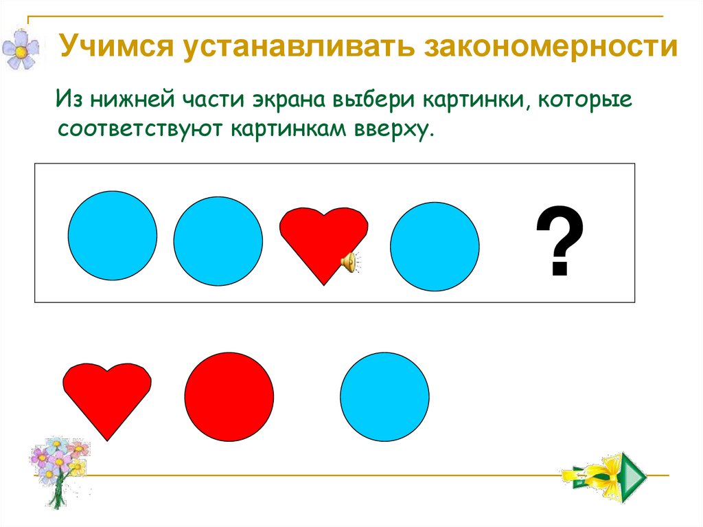 Учимся устанавливать закономерностиИз нижней части экрана выбери картинки, которые