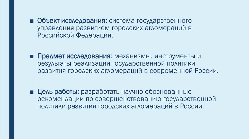 ■ Объект исследования: система государственногоуправления развитием городских агломераций в