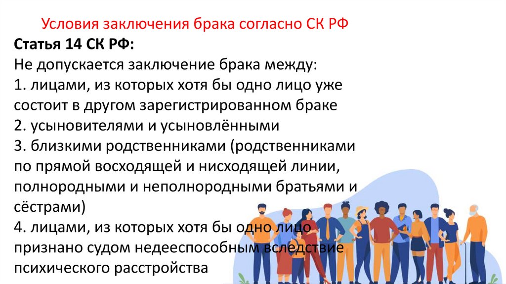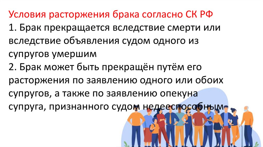 Условия расторжения брака согласно СК РФ1. Брак прекращается вследствие смерти или