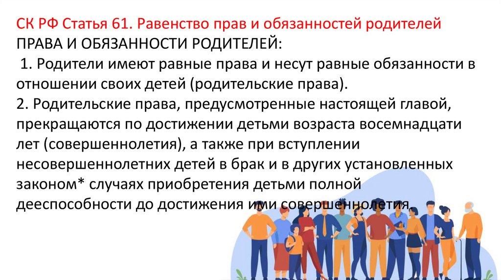 СК РФ Статья 61. Равенство прав и обязанностей родителейПРАВА И ОБЯЗАННОСТИ РОДИТЕЛЕЙ: