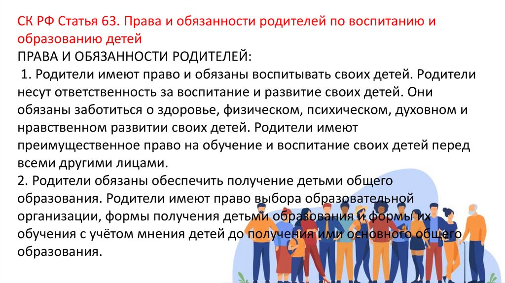 СК РФ Статья 63. Права и обязанности родителей по воспитанию иобразованию детей