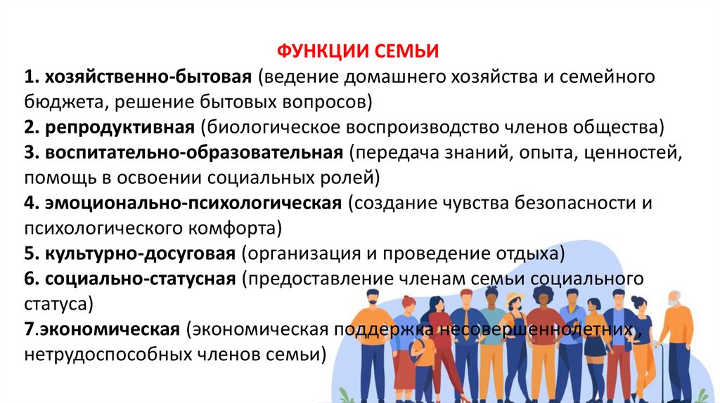 ФУНКЦИИ СЕМЬИ1. хозяйственно-бытовая (ведение домашнего хозяйства и семейного