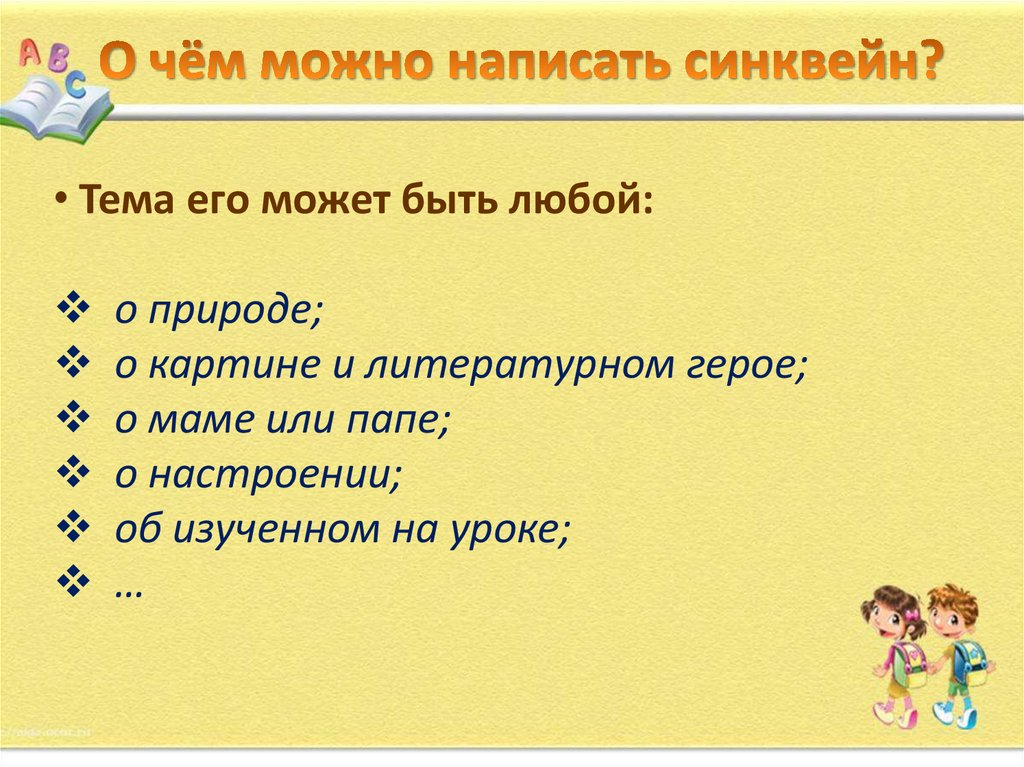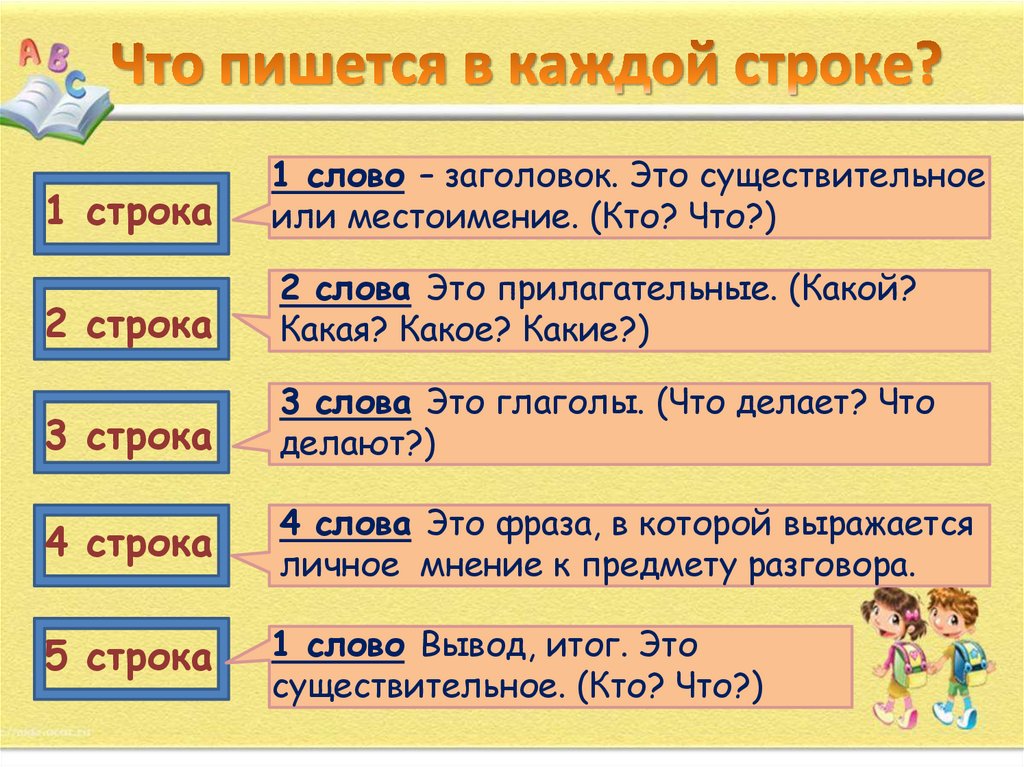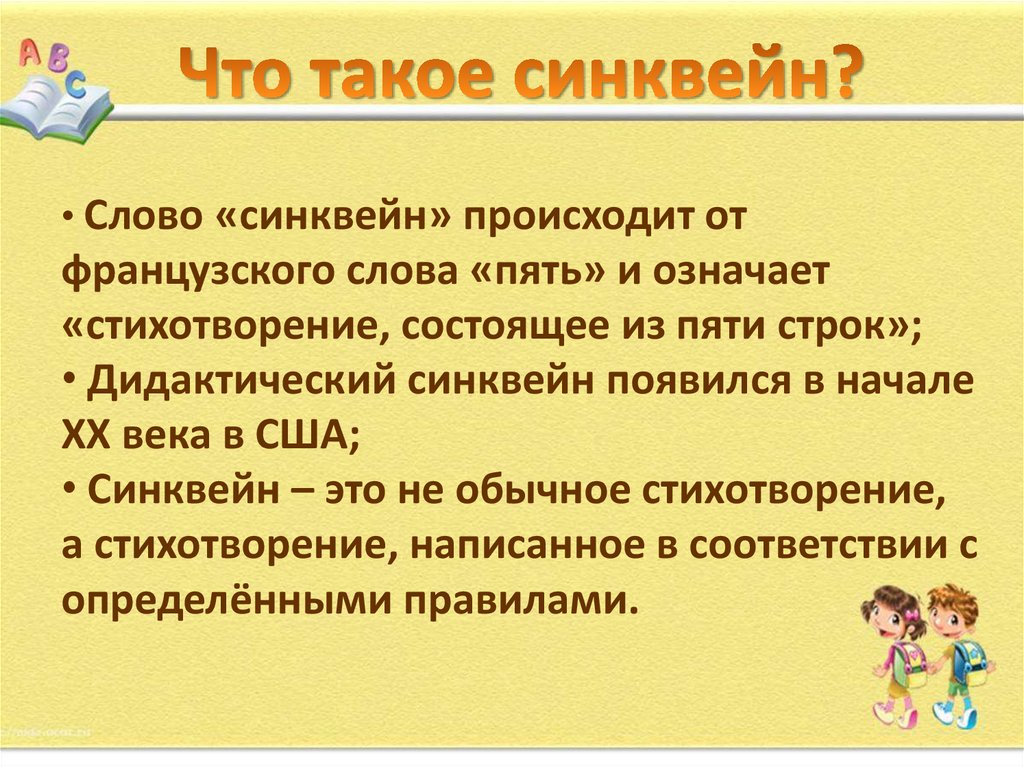 • Слово «синквейн» происходит отфранцузского слова «пять» и означает