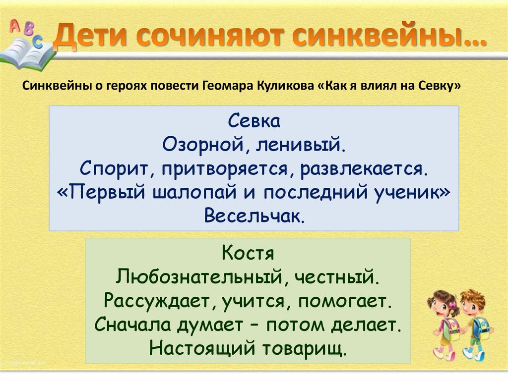 Синквейны о героях повести Геомара Куликова «Как я влиял на Севку»Севка