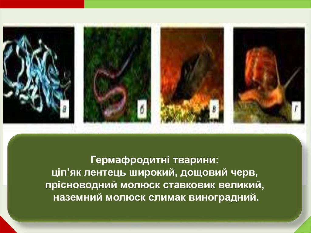 Гермафродитні тварини:ціп’як лентець широкий, дощовий черв,