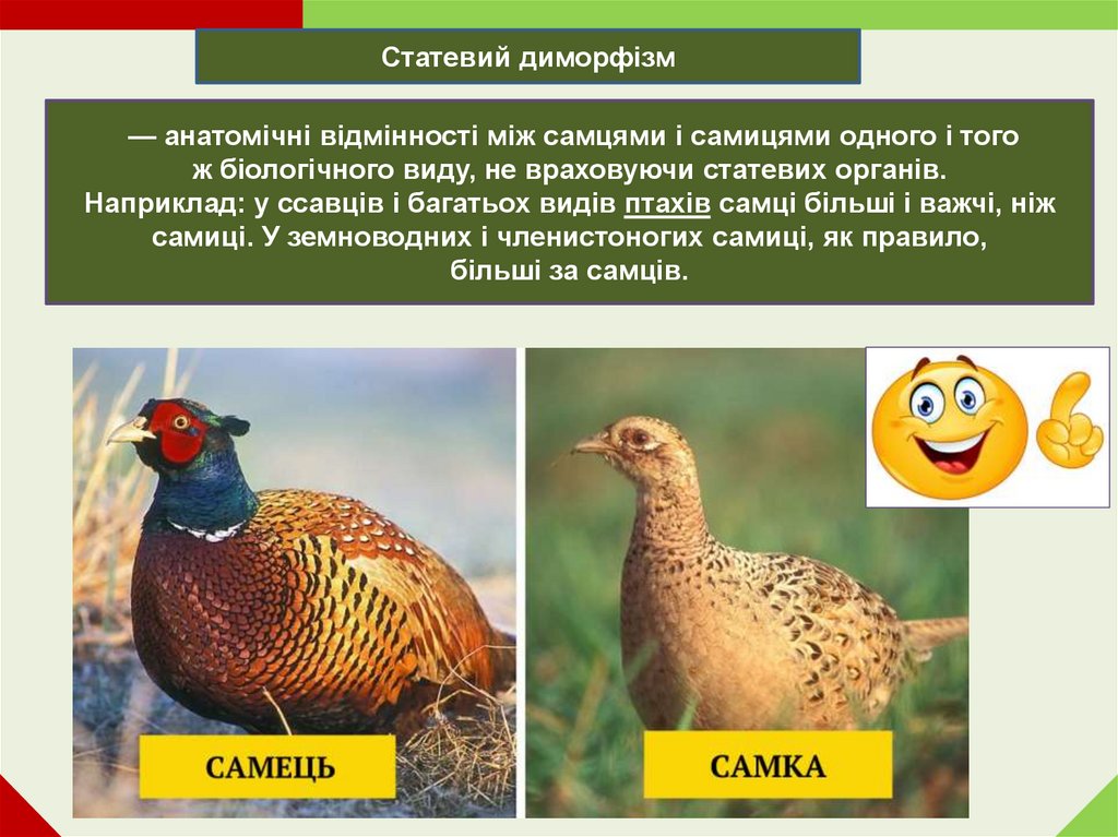 Наприклад: у ссавців і багатьох видів птахів самці більші і важчі, ніж