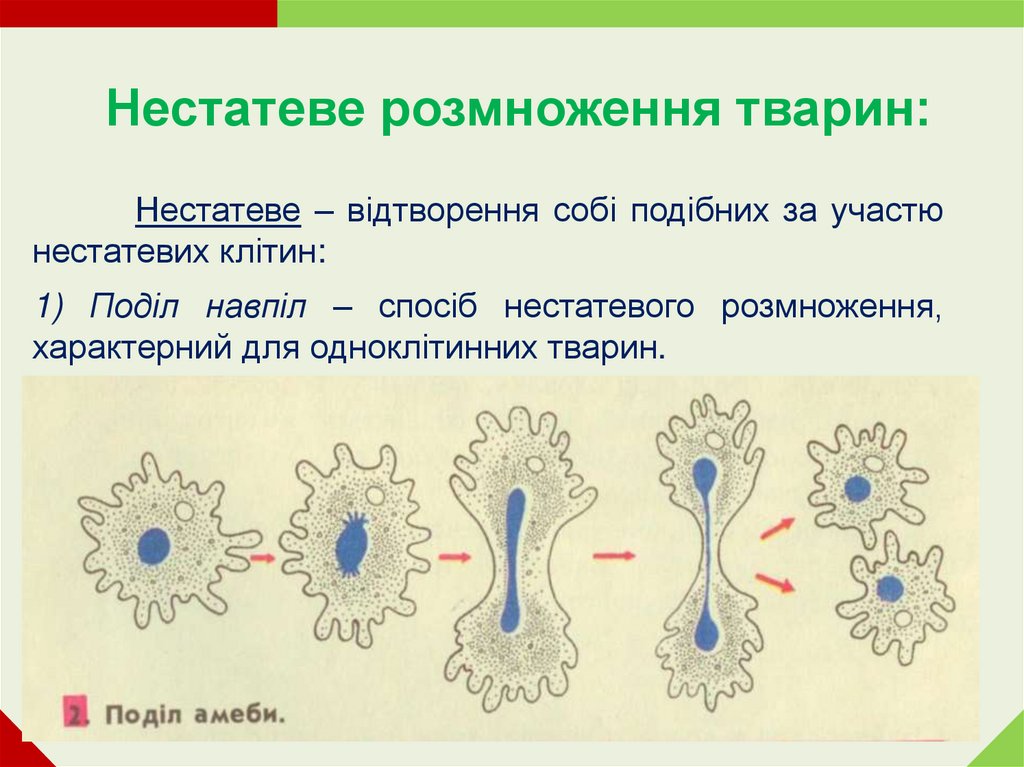 1) Поділ навпіл – спосіб нестатевого розмноження,