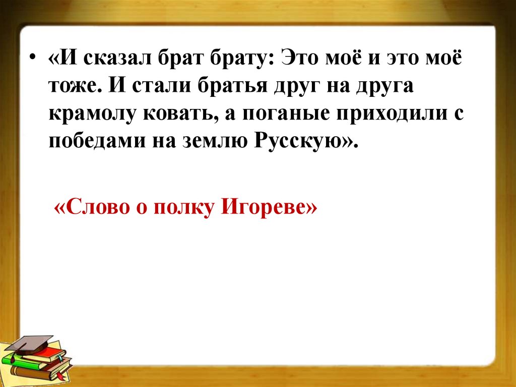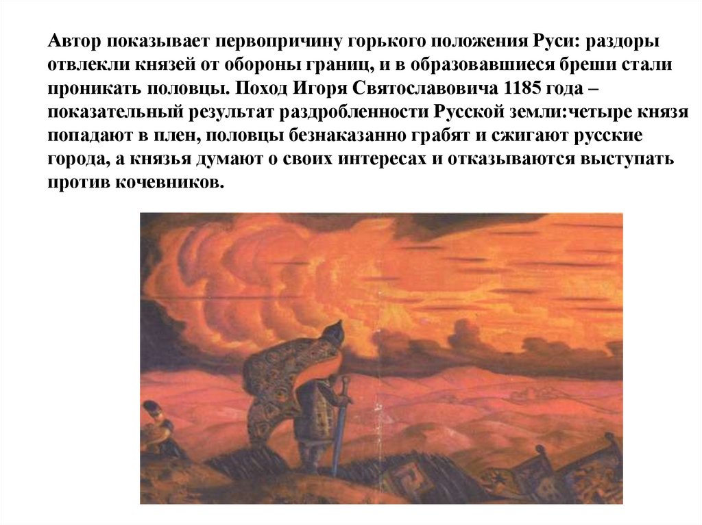 Автор показывает первопричину горького положения Руси: раздорыотвлекли князей от обороны границ, и в образовавшиеся бреши стали