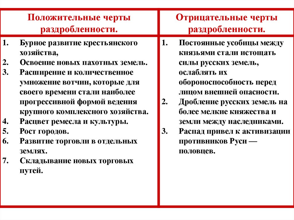 - Развитие и подъем хозяйственной и культурной жизни;- Междоусобные войны;