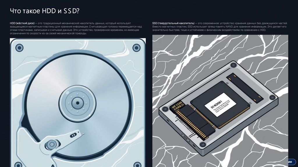 На изображении выше показаны внутренние компоненты HDD и SSD. Слева — HDD с его механическими частями: вращающимися пластинами и считывающей головкой. Справа — SSD с электронными компонентами: микросхемами флеш-памяти и контроллером, демонстрирующими отсутствие