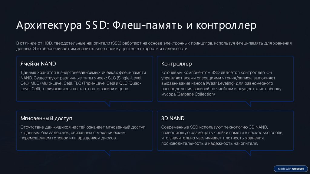Вместо магнитных пластин, SSD использует флеш-память NAND для хранения информации. Это делает его