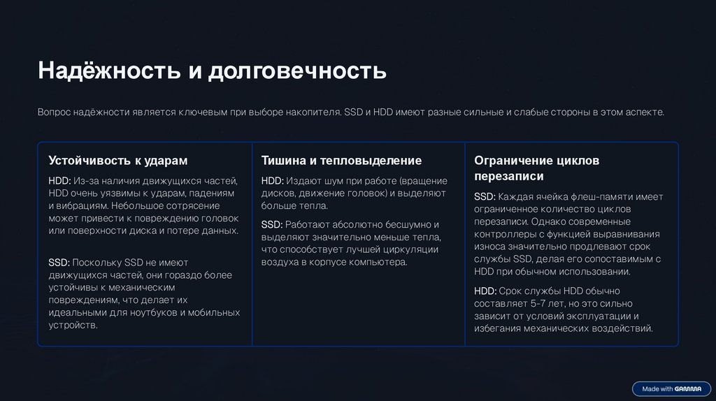 Надёжность и долговечностьВопрос надёжности является ключевым при выборе накопителя. SSD и HDD имеют разные сильные и слабые стороны в этом аспекте.