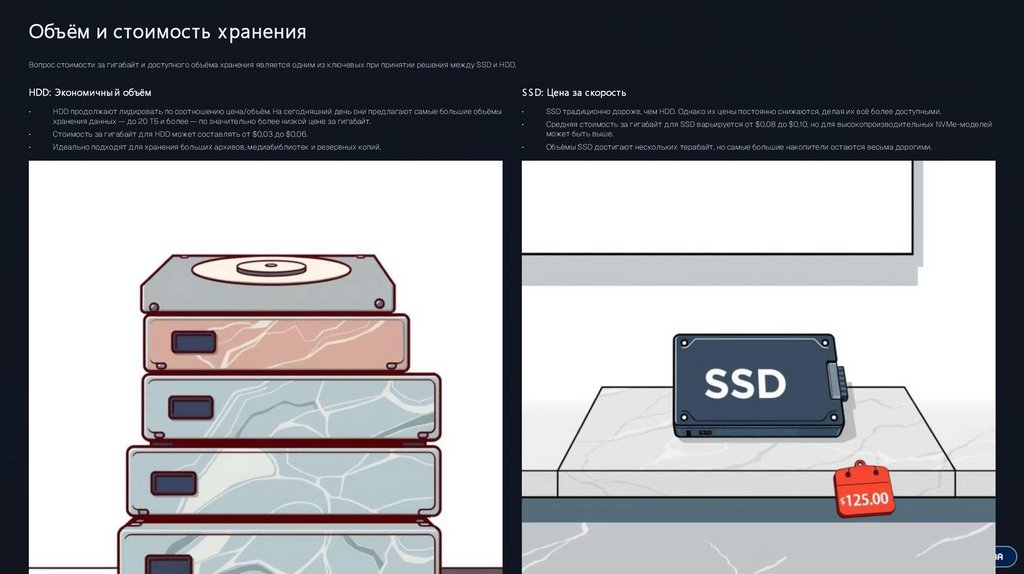 Объём и стоимость х раненияВопрос стоимости за гигабайт и доступного объёма хранения является одним из ключевых при принятии решения между SSD и HDD.