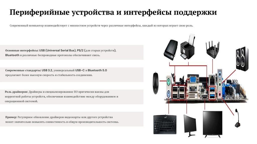 Периферийные устройства и интерфейсы поддержкиСовременный компьютер взаимодействует с множеством устройств через различные интерфейсы, каждый из которых играет свою роль.