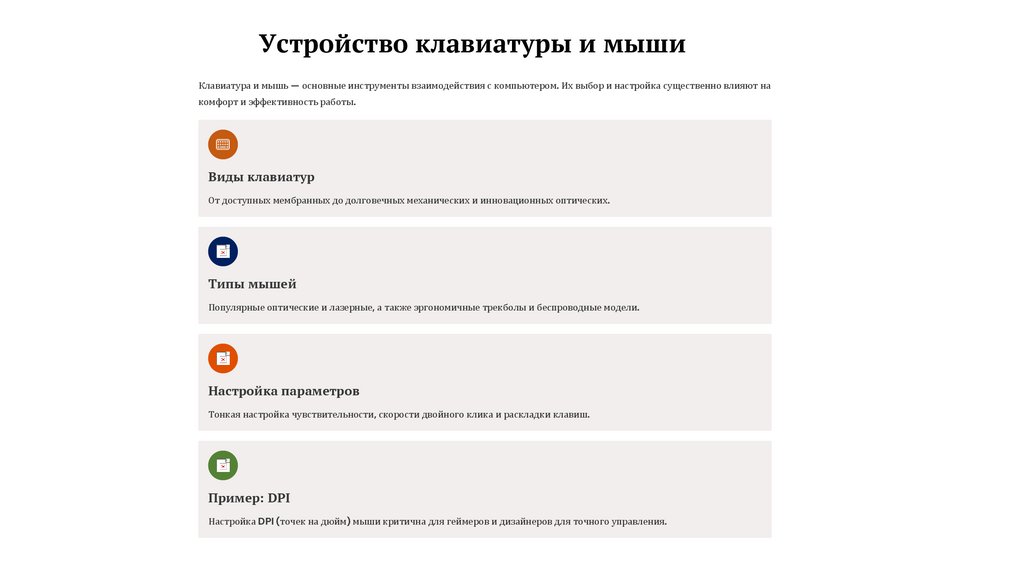 Устройство клавиатуры и мышиКлавиатура и мышь — основные инструменты взаимодействия с компьютером. Их выбор и настройка существенно влияют на