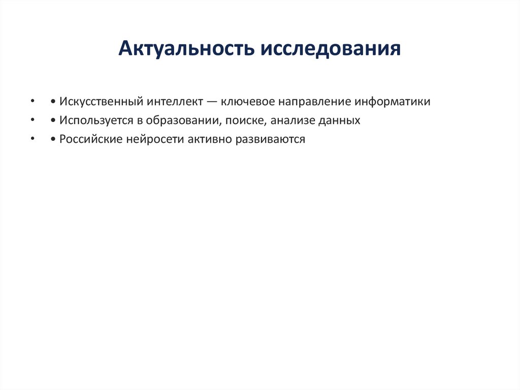 Актуальность исследования• Искусственный интеллект — ключевое направление информатики