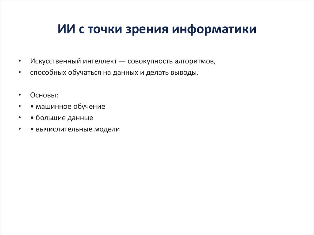 ИИ с точки зрения информатикиИскусственный интеллект — совокупность алгоритмов,