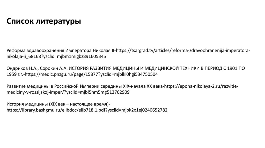 Список литературыРеформа здравоохранения Императора Николая II-https://tsargrad.tv/articles/reforma-zdravoohranenija-imperatoranikolaja-ii_68168?ysclid=mjbm1migbz891605345