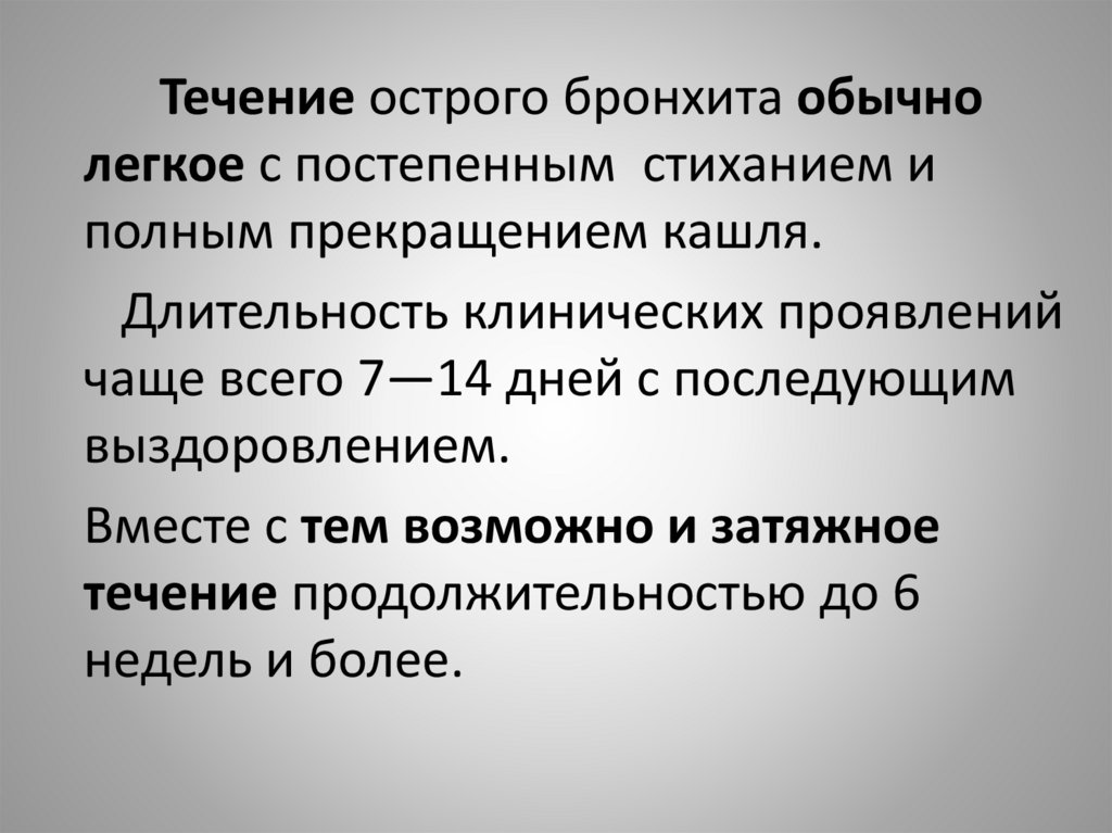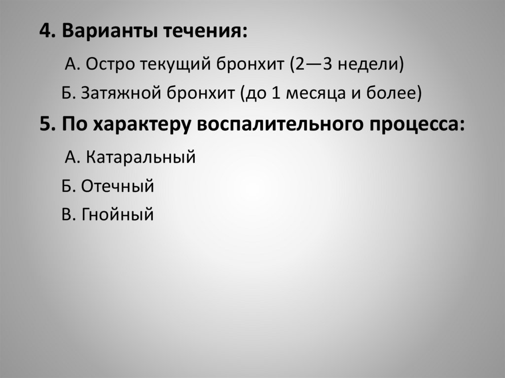 4. Варианты течения:А. Остро текущий бронхит (2—3 недели)