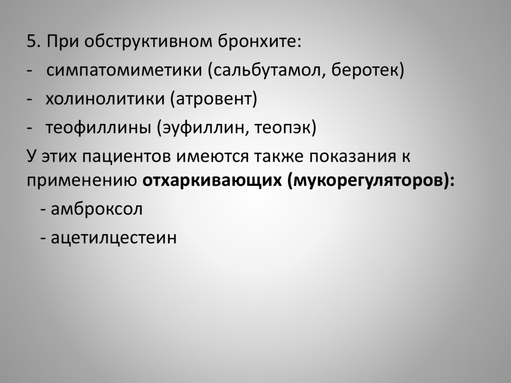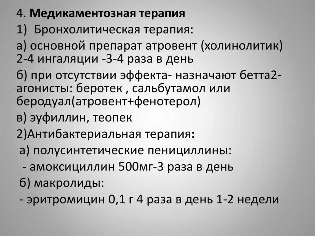 4. Медикаментозная терапия1) Бронхолитическая терапия: