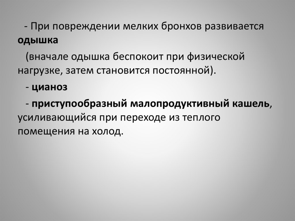 • Одышка возникает при обструкциибронхов и бронхиолите, т.е.