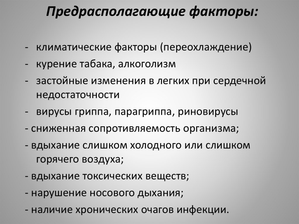 Предрасполагающие факторы:- климатические факторы (переохлаждение)