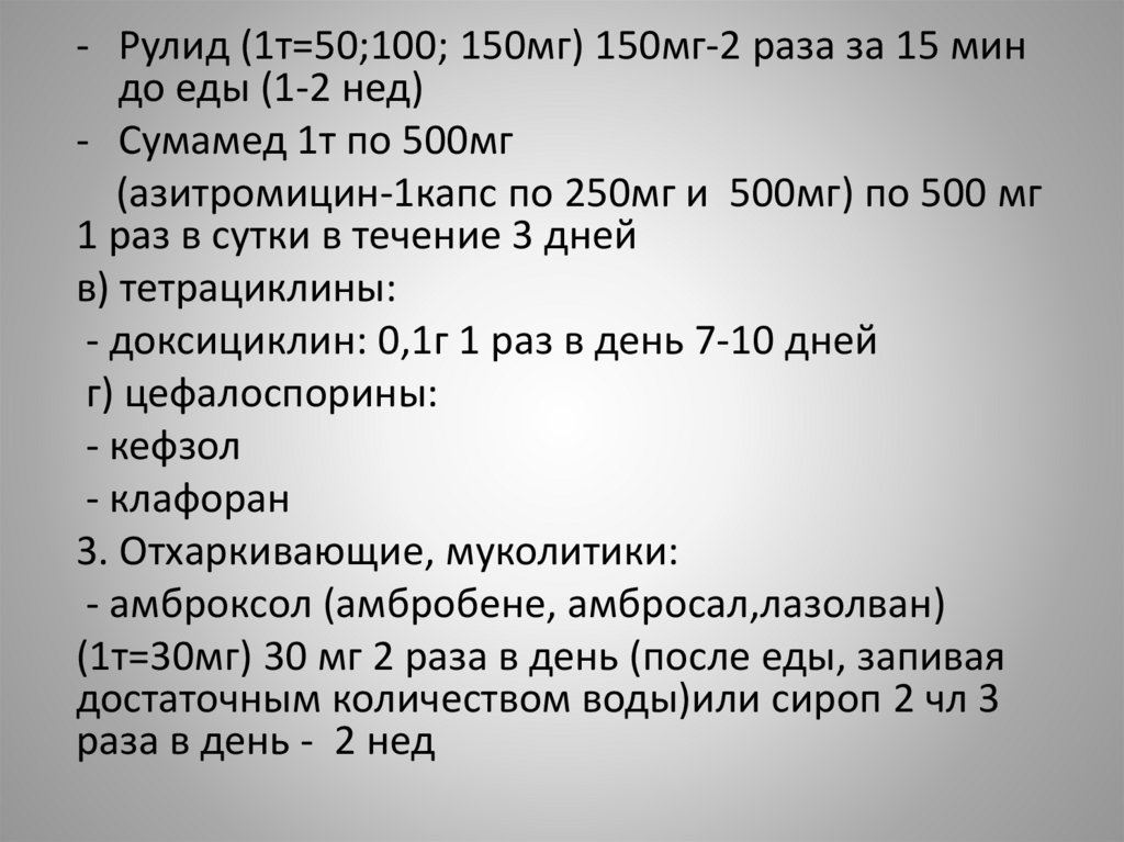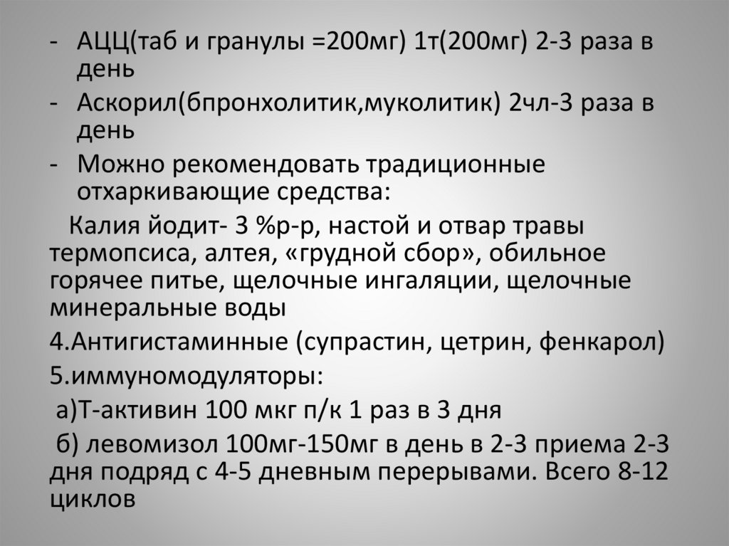 - АЦЦ(таб и гранулы =200мг) 1т(200мг) 2-3 раза вдень