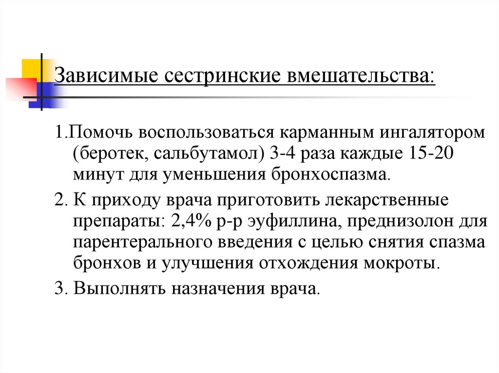 Зависимые сестринские вмешательства:1.Помочь воспользоваться карманным ингалятором