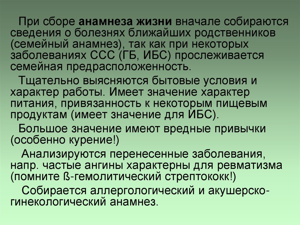 При сборе анамнеза жизни вначале собираютсясведения о болезнях ближайших родственников