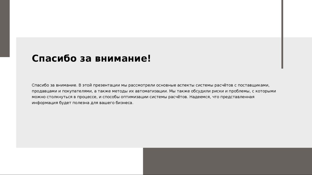 Спасибо за внимание!Спасибо за внимание. В этой презентации мы рассмотрели основные аспекты системы расчётов с поставщиками,