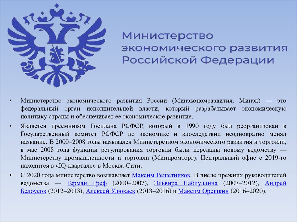 Министерство экономического развития России (Минэкономразвития, Минэк) — это