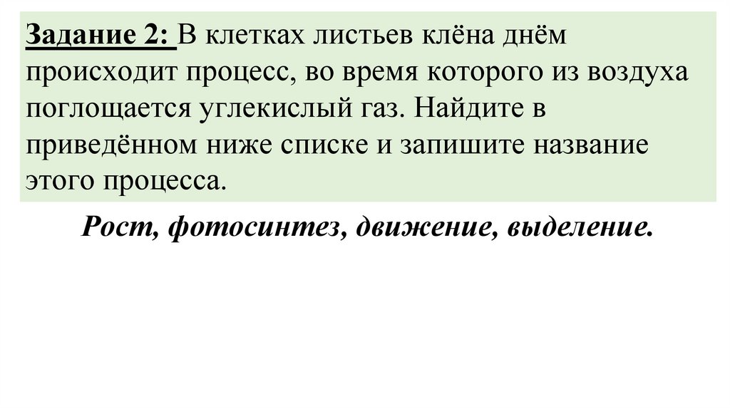 Задание 2: В клетках листьев клёна днёмпроисходит процесс, во время которого из воздуха
