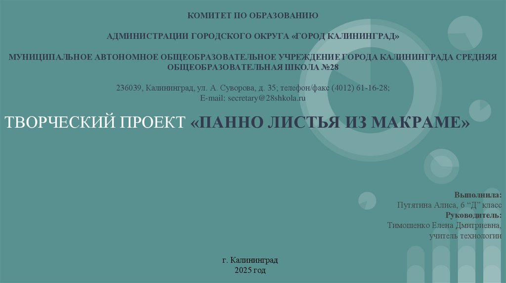 236039, Калининград, ул. А. Суворова, д. 35; телефон/факс (4012) 61-16-28;