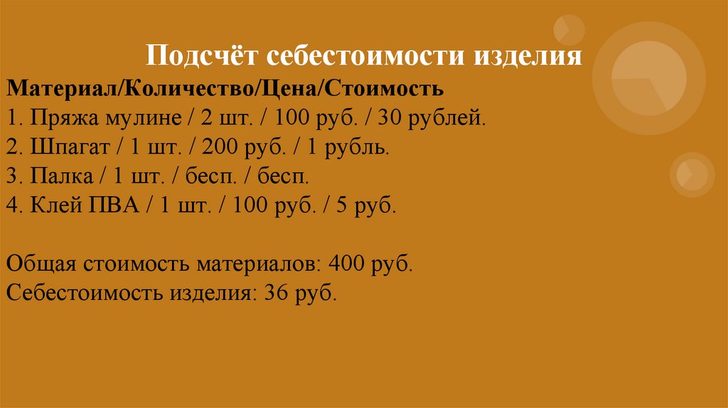 Подсчёт себестоимости изделияМатериал/Количество/Цена/Стоимость