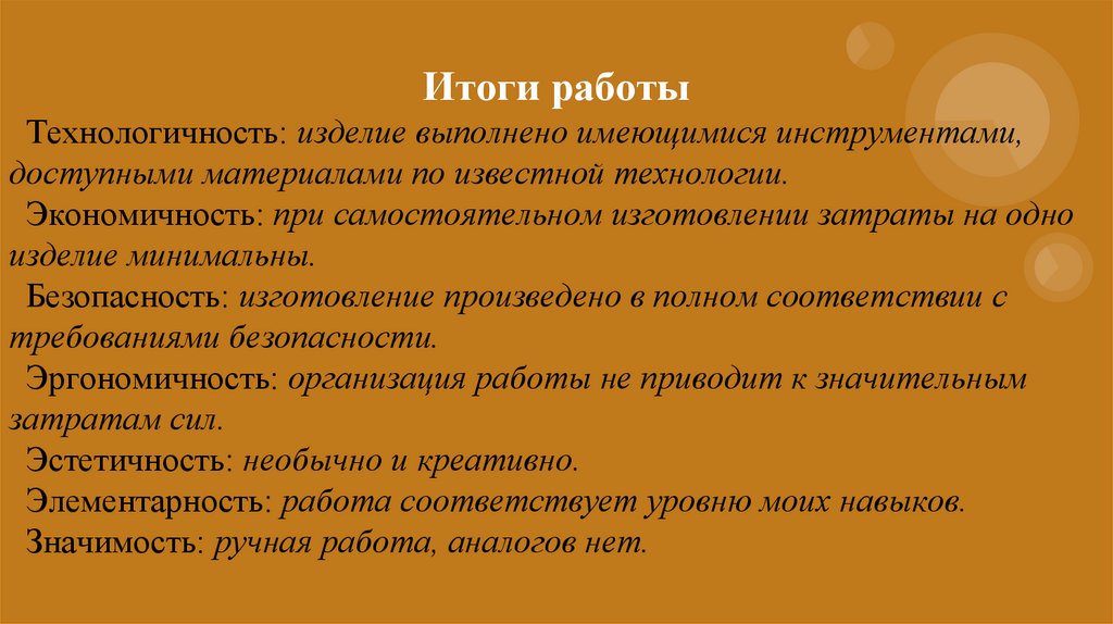 Итоги работыТехнологичность: изделие выполнено имеющимися инструментами,