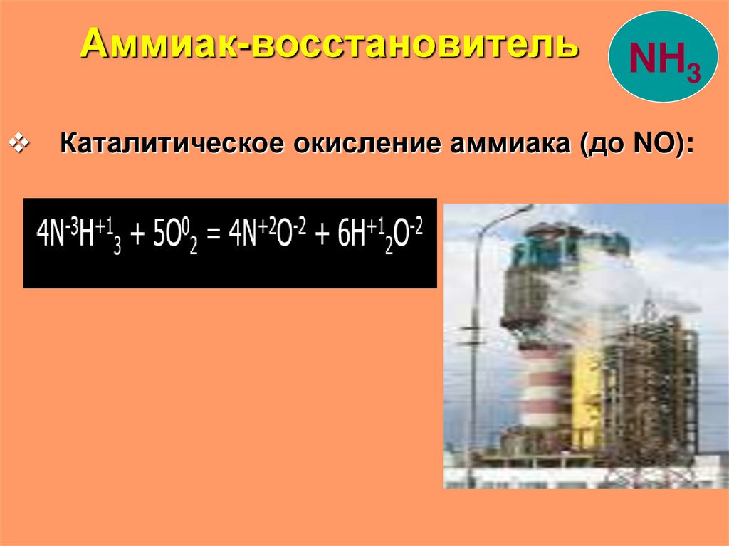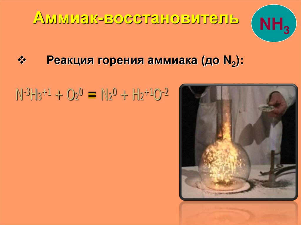 Аммиак-восстановительРеакция горения аммиака (до N2):