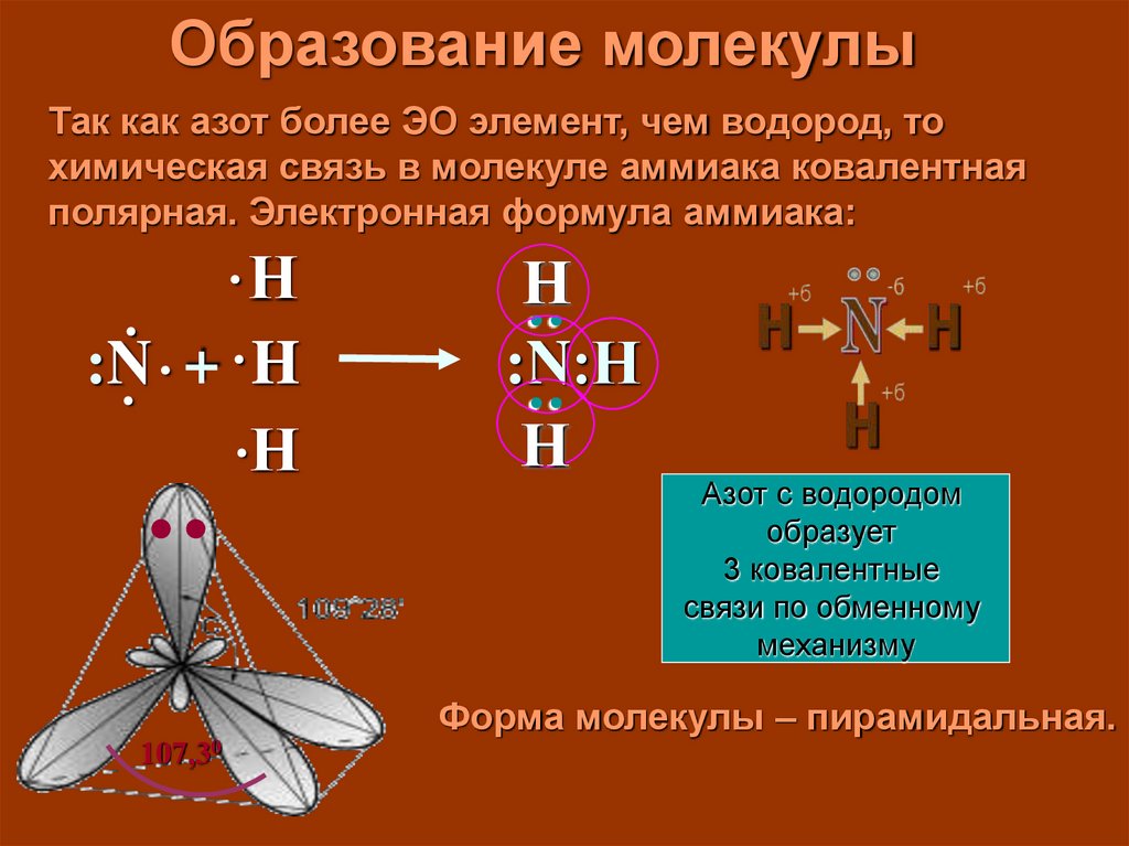 Образование молекулыТак как азот более ЭО элемент, чем водород, то