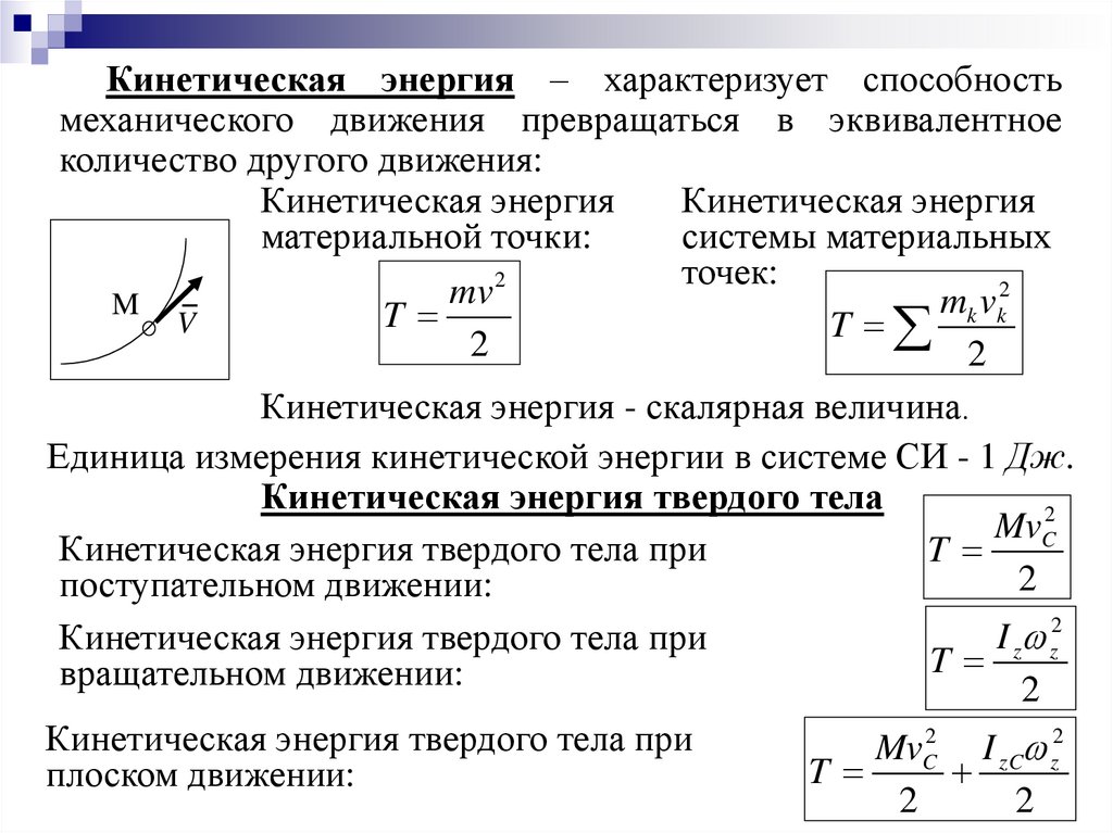 Кинетическая энергия – характеризует способностьмеханического движения превращаться в эквивалентное