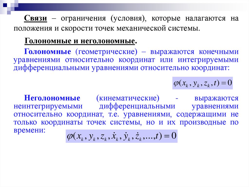 Связи – ограничения (условия), которые налагаются наположения и скорости точек механической системы.