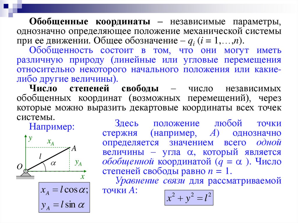 Обобщенные координаты – независимые параметры,однозначно определяющее положение механической системы