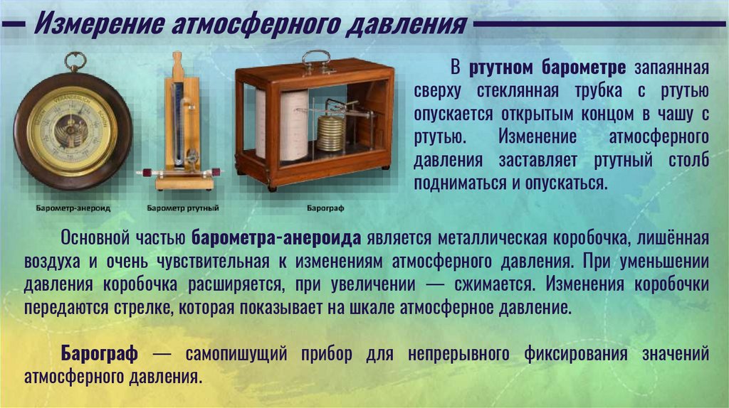 Измерение атмосферного давленияПрибором для измерения атмосферного давления является
