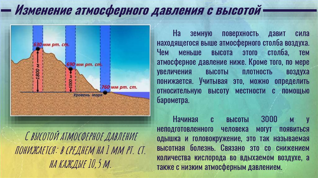 Изменение атмосферного давления с высотойНа земную поверхность давит сила