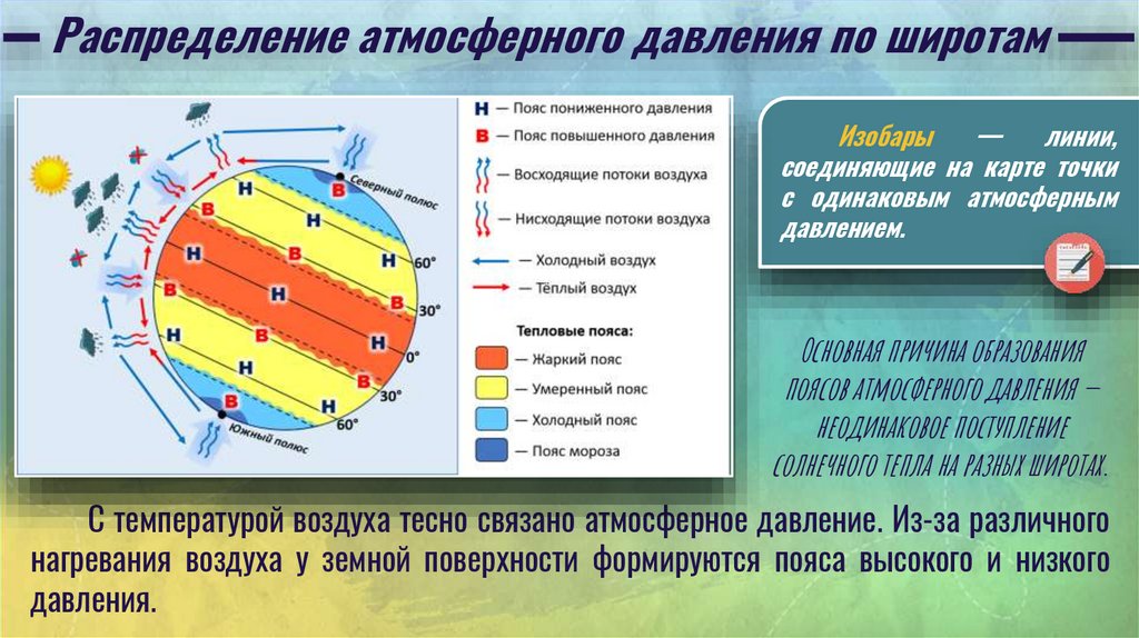 С температурой воздуха тесно связано атмосферное давление. Из-за различного
