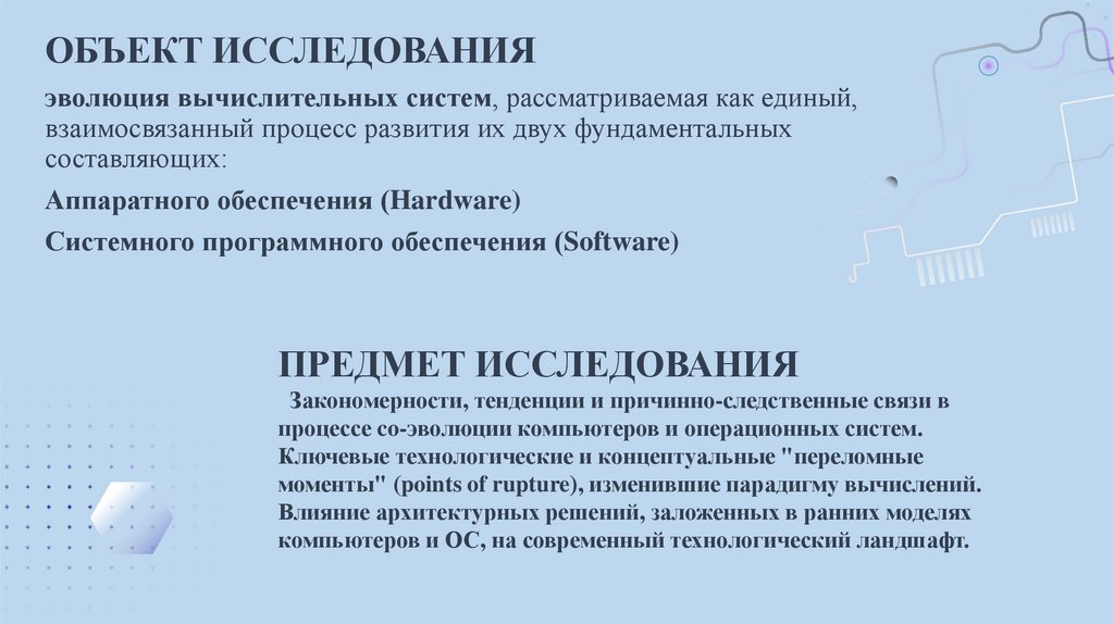 ОБЪЕКТ ИССЛЕДОВАНИЯэволюция вычислительных систем, рассматриваемая как единый,