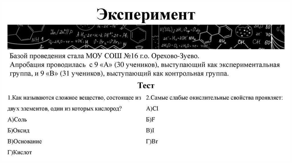 ЭкспериментБазой проведения стала МОУ СОШ №16 г.о. Орехово-Зуево.