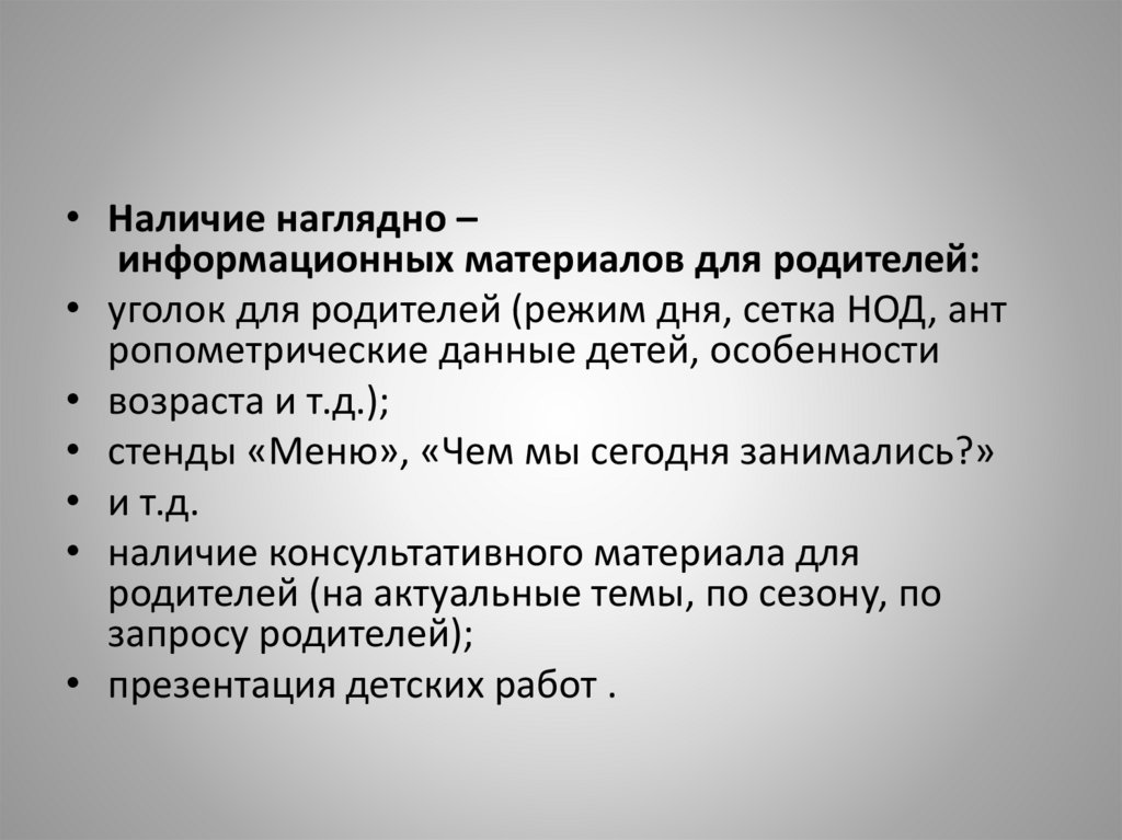 • Наличие наглядно –информационных материалов для родителей: