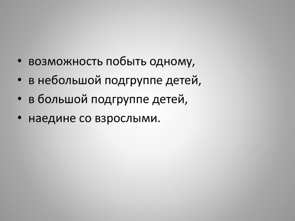 • возможность побыть одному,• в небольшой подгруппе детей,